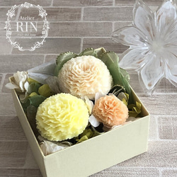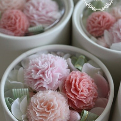 アーティフィシャルフラワーやリボンアレンジ等を取り入れたオリジナルアレンジで、カービング作品をより魅力的なものに演出。