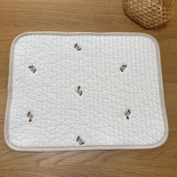 こちらのカフェマットは3枚目です、とても丁寧に作られていて使いやすく肌触りも良く我が家のワンコも気に入っているようでソファの定位置、車の中、バギーにと活躍しています。今回もおまけありがとうございました。大切に使わせていただきます。