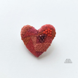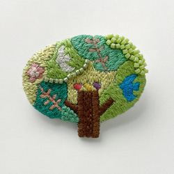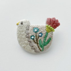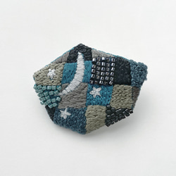 図案のデザインや色合いがかわいく、すてきで、きれいに作られていて、見ているだけでとても楽しいです。ビーズがアクセントになっていて、また、糸も少し光っているように見えます。やさしい雰囲気で、どこかノスタルジックさもあるブローチだなと思いました。