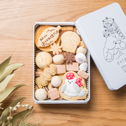 シマエナガのドットと水玉ワンピースのポルカのアイシングクッキーが絵本のようなクッキー缶を演出いたします。