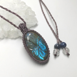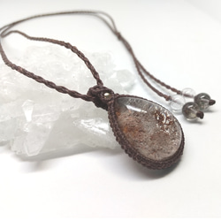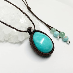 思っていたよりマクラメ網の部分(紐の部分)が明るい綺麗なブルーでした。ブルーとこげ茶色がとても良くあっていて素敵です。マクラメ網のクロスがガーデンクォーツのペンダントとはまた違う雰囲気で、実際に届いて一層お気に入りになりました