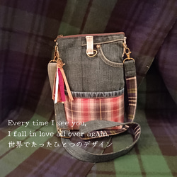 商品の生地は古着デニムをリメイクし、ブルーの色合いやポケットの配置がふたつとして同じものがない、世界でたった一つのデザインです。バッグの裏地にも古着のシャツを使い、素材や柄のコンビネーションが楽しいデザインです。