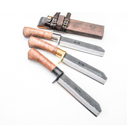 大は藪漕ぎ用と邪道かも知れませんが、鰹を下ろすのに使おうと考えています。Cタイプの形が房州の野鍛冶屋さんが作る鰹包丁にそっくりです。鰹包丁も作る職人さんが少なくなって殆ど売られていません。包丁を交換せずに丸から刺身まで使えそうです。中は竹を割ったり加工したり普段使いのナイフとして使い回しが良さそうです。小はシンコ(コハダ)を捌いて寿司を作るのに使おうと考えています。鞘も良い作りで藪漕ぎで転んでも安心です。革シースは転んで刃が突き抜けた経験があります。