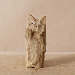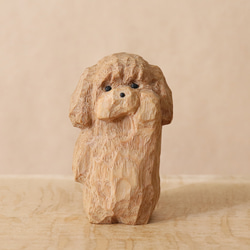 この作品はトイプードルを何点か彫った内の一つですが、この子だけ左手を挙げています。