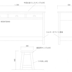 素材はパイン材で、仕上げは、ミルキーホワイト塗装4回塗りの上、サンドペーパーにてシャビーな感じでの仕上げとなります。