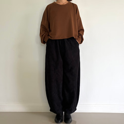 ワイドパンツで、ゆとりがあるラインなのに腰回りから裾にかけて、スッキリ見えるデザインにしています。