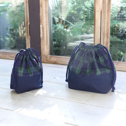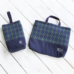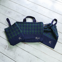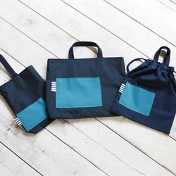 黒と白のストライプと、エメラルドグリーンの切り替え布という絶妙な組み合わせの持ち手付き体操着入れです!