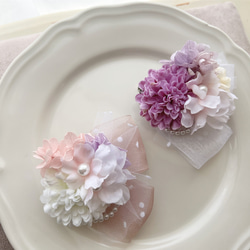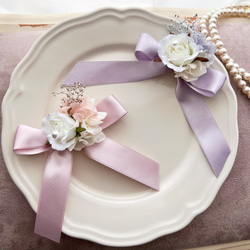 素材:プリザーブドフラワー、フェイクパール、アートフラワー、2way金具(クリップ、安全ピン)