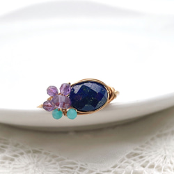 アメジストに桜モチーフのピンクシェルと、柔らかな輝きを添えるピンク系の天然石を組み合わせたワイヤーリングです。