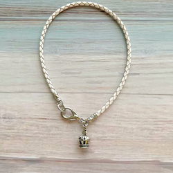 リニューアルです!編み込みレザー(ピンク)4㎜にゴールドの金具、16㎜×20㎜のオーバル型の小さな迷子札チャーム、一粒のベビーパールがつけられたチョーカーです。