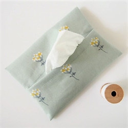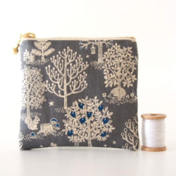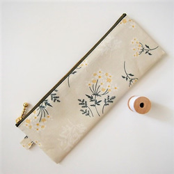 *防水コットン ペンケース 歯ブラシケース ペタンコ ファスナーポーチ*ホワイトレースフラワー グレイッシュグリーン