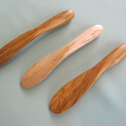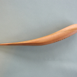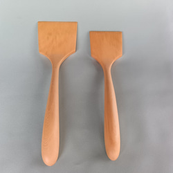 4枚目から6枚目の写真は、我が家のフライ返し(ミズメザクラ材)です。形は不出来ですが、現在もお好み焼きや餃子の時は重宝しています。小さい方は、卵焼きなど小さいフライパンの時に便利です。10年以上使い込んでいますが丈夫です。