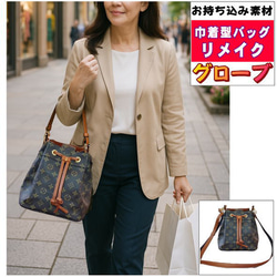 写真の場合はお持ち込みいただいた生地を正面・背面に使用し、マチ・手紐等は弊社の合皮を使用しました。