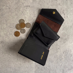 GIVING LIFEオリジナルの刺繍を所々に施しました。正面ポケットのフタを開けたり、背面のカードを出したりのアクションによって刺繍がチラッと見えて楽しみが増えるようなポシェットです。
