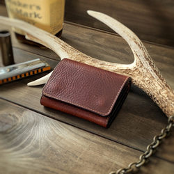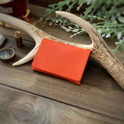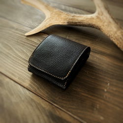 シャープなデザインのフラップにくるみボタンとハンドステッチによる温かみあるクラフト感を融合させたカード&パスケースになります。