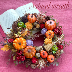 かぼちゃを中心に赤や緑や黄色などなど、たっぷりの木の実やお花を使用し、賑やかでとっても可愛い、ハロウィンリースに仕上がりました。