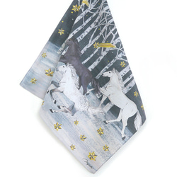 淡く輝く白樺の木々と大地、流れ星とともに馬たちが駆けていく…、そんな幻想的な光景をシックに描きました。