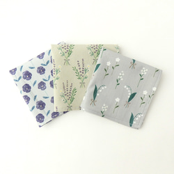 shocotsオリジナルのカーネーションのガーゼハンカチ1枚と、チューリップとラベンダーのコットンハンカチ2枚が入った、Creema限定ギフトです。