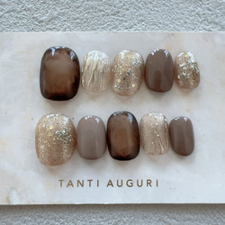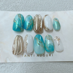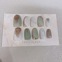 様々なお洋服に合わせやすい使い勝手の良いベリーショートネイルチップデザインです。親指部分、薬指部分、小指部分は流行りで大人気のネイルカラーのピスタチオグリーン。上品で女性らしい緑色で話題のピスタチオグリーンを贅沢に3本ご用意しました。さらにこのピスタチオグリーンのネイルチップには金箔があしらわれています。金箔はご存知、ゴールドに光り輝く高級品の代名詞でもあります。ピスタチオグリーンのネイルチップに金箔が施されている事で上品な緑色ピスタチオグリーンに高級感やゴージャスなイメージが上乗せされます。さらに、人指し指部分、中指部分のネイルチップはシンプルに描いたリーフ柄。ベージュ色のベースカラーにプロのネイリストがジェルネイルを手書きで描いたリーフ柄は主張し過ぎない適度な存在感で合わせる女性の雰囲気や、合わせるお洋服、合わせるシーンの邪魔をしません。流行りのピスタチオグリーンを使い最新のネイルチップのジャンルでありながら、ベージュ色にシンプルリーフ柄。使い勝手が良く、ネイルチップで失敗したくない女性におすすめです。短い爪小さい爪専用のベリーショートネイルチップなのでチビ爪女性でも安心安全です。