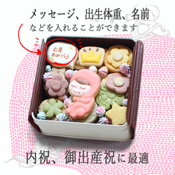 赤ちゃんアイシングクッキーの部分にお子様のお名前と出生体重をお入れすることができます。(お誕生日でも可能です!)