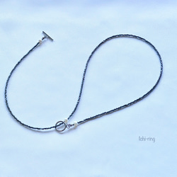 ブラック、ホワイト、グレーのカラーと形の異なる3種のフェイクパールをつないだショートネックレスです。