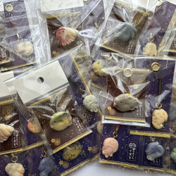 練り切り部分は樹脂粘土、飴部分はすけるくんとレジン、金平糖はすけるくんです。
