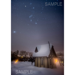 足跡一つない雪原には、寄り添う2本の木。そして背景には明け方に横たわる春浅い天の川です。
