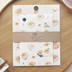 みそダレ&からしのシール付きです。こちらはノーカットですので、自由に切り取りご使用ください。当ショップのレターセット(おいしいステーショナリー)の便箋には全て、文字を書く際の罫線がございます。