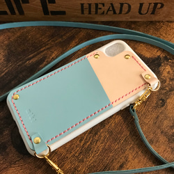本革のiPhoneケース落ちないカード入れのポケット付きに ストラップ、ネックストラップ ショルダーストラップをオプションで選べます