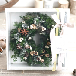 生のままのグリーンを使用したクリスマスリースです。