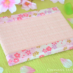 まんまるの小さな椿が咲いているちりめん生地と、熊本県八代産の天然い草を使った畳表(たたみおもて・ゴザ部分)をあわせたミニ畳です。