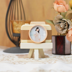 このカメラ型フォトフレームは、エレガントなベージュのフェイクレザーと洗練されたオフホワイトのフレームが特徴です。