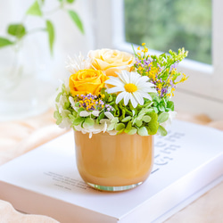 花材:プリザーブド(ローズ、カーネーション、アジサイ、カスミ、グリーンリーフ)、ドライ(デイジー)