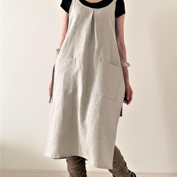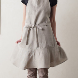 長方形の前身頃と後ろ身頃を肩紐部分で繋ぎ、ウエスト両サイドで結んでご着用頂くこちらのエプロン。