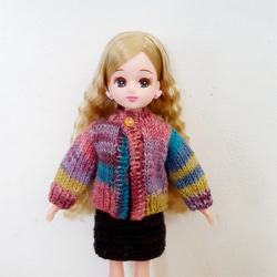 棒針を使って手編みで編んだリカちゃん人形サイズのカーディガンです