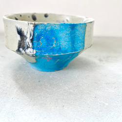 トロリと掛かった緑青色の釉薬の部分と、スクラッチの入った艶消しの水色、地色の鮮やかな茶の対比が楽しい。