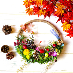 秋の可愛いアイテムを盛り込んだ秋リースです。