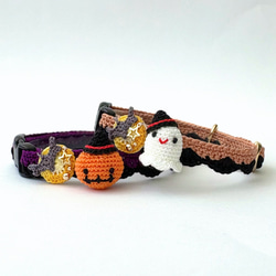 ①レース糸で作ったお花のモチーフをあしらいました。モチーフは猫さんの視界に入りにくい首輪の側面に取り付けています。