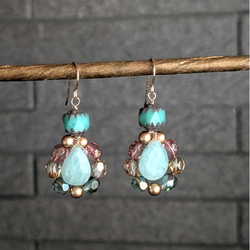 白やベージュの装いに映えるのが、ラピスラズリと共に取り巻く天然石のニュアンスブルー
