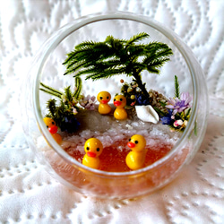 樹脂粘土で手作りした白いうさぎちゃんととプリザーブドフラワーのお花がちょこんと乗っています。