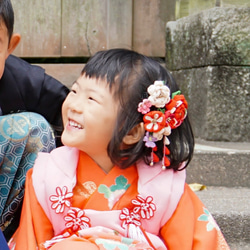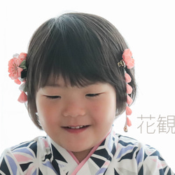 つまみ細工の古典的なレトロな雰囲気に、明るく華やかなお着物のトータルコーディネートになるように作りました。クリップで簡単にお好きなところに飾れます。白っぽい部分はアイボリーを使っています。モデルさんは3歳です。