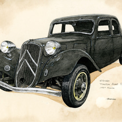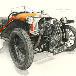 極細の線が引ける製図用ペンを使用し、ハッチングと水彩で仕上げたクラシックバイクのイラストになります。