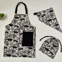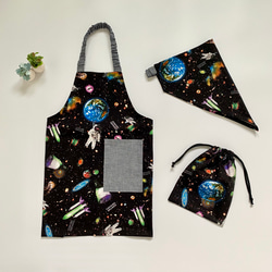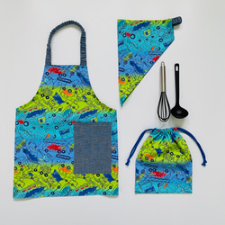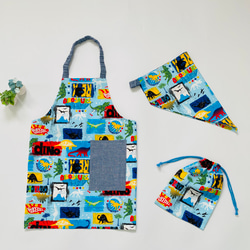 沢山の電車柄がカッコいい、こども用エプロンセットです。