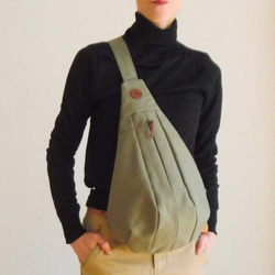 国産の8号帆布生地で作りました、しずく型(ドロップ型)のボディバッグです。しっかり張り感のある帆布ですので、しずく型の形状を綺麗に出してくれています。上部は小さく、下に向かって膨らみが大きくなる、すっきりとしたドロップ型のボディバッグです。