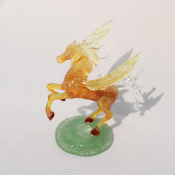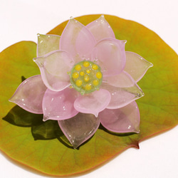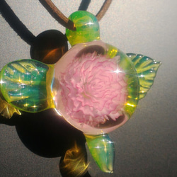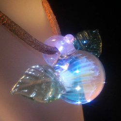 ガラスペンの上に桜と葉をつけました。色ガラスとゴールドを加えてピンクのグラデーションを作りました。ペンの本体は琥珀色のガラスで作られています。