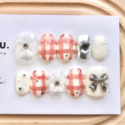 淡色わんわんクリーム【サイズオーダー制】¦ネイルチップ チェック柄 犬 落書き フラワー ビーズ ベージュ 短め
