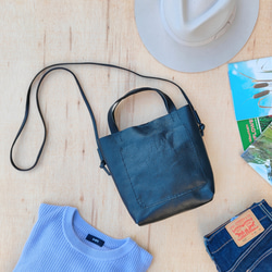 クロム鞣しのシュリンクレザーで、バッグが自立できるほどの硬さです。
