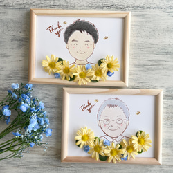 プリザーブドフラワー付き似顔絵オーダー 色鉛筆と水彩のほんわかタッチ 家族の似顔絵 お誕生日 記念日 2Lサイズ