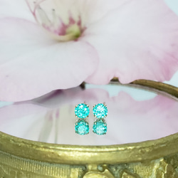 他の人工パライバトルマリンと比較しますと、キラキラと輝きますので飽きにくく、また、ガラス素材のブルーグリーンカラーや、キュービックジルコニアのパライバカラー等と比較しますと、より多彩な色味が現れますので、やはり、ずっと見ていたくなる様な、飽きの来ない色味が特長です。