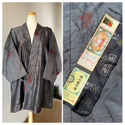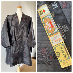 大島紬 着物リメイク 作務衣 古典花模様 横双 和のお洒落上衣 シルク上着 簡単和服